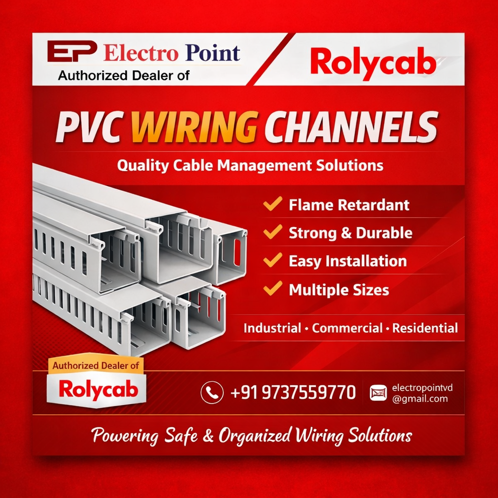A PVC wiring channel, also known as cable trunking or a wire duct, is an essential component for modern electrical installations. It is designed to organize, protect, and conceal electrical wires and cables, creating a neat and professional finish. The Rolycab brand featured in the image is a slotted-type PVC wiring channel, which includes specific features that make it a superior choice for cable management Electro Point is a trusted supplier and an authorised dealer of genuine Rolycab Industries products. Strategically located in the GIDC industrial hub of Vadodara, they are positioned to efficiently serve the needs of panel builders, industrial contractors, and residential electricians.